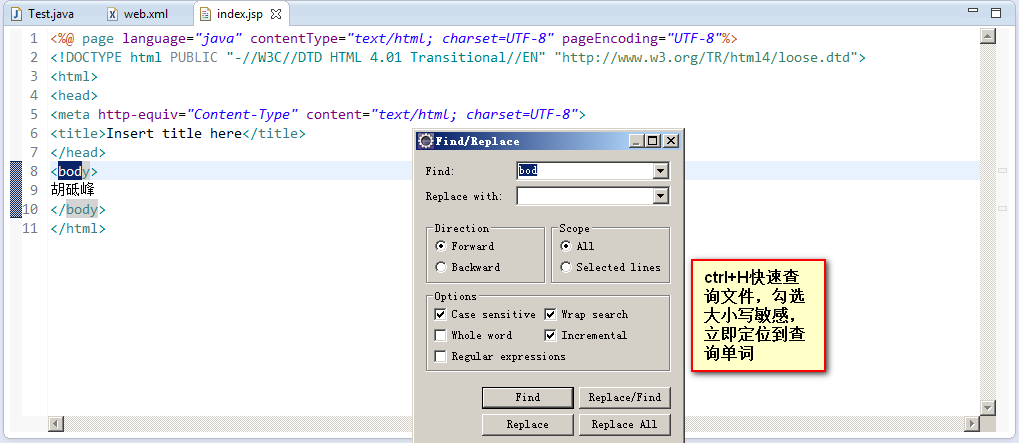 18_ctrl+H快速查询文件,勾选大小写敏感,立即定位到查询单词